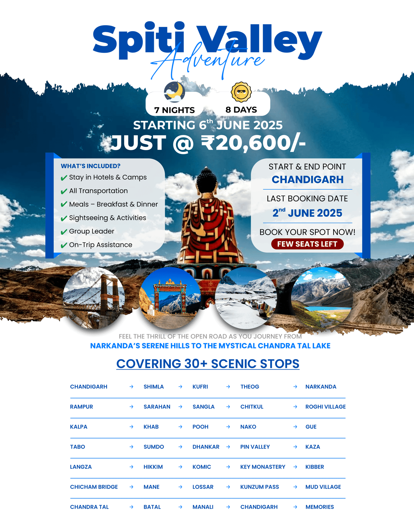 Join us for an unforgettable journey to Spiti Valley — the land of rugged beauty, ancient monasteries, and heart-pounding adventures. Whether you're a solo traveler, couple, or a squad — Spiti is calling.